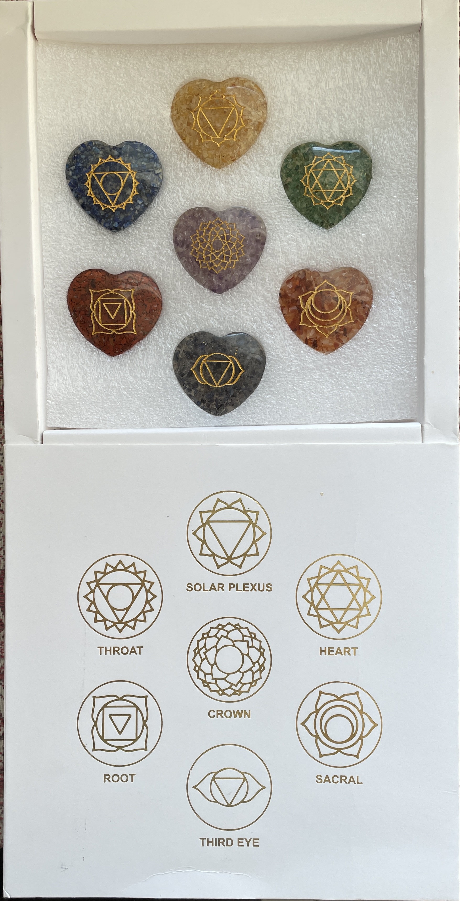 • A complete 7 chakra stone set securely packed in a wood-carved box with a removable lid.
